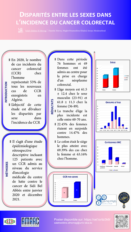 El Herrag, Salah Eddine, et al. Disparités Entre Les Sexes Dans l’Incidence Du Cancer Colorectal. Arab Medical Association Against Cancer (AMAAC) and Algerian Society Of Training & Research In Oncology (SAFRO), 2022.