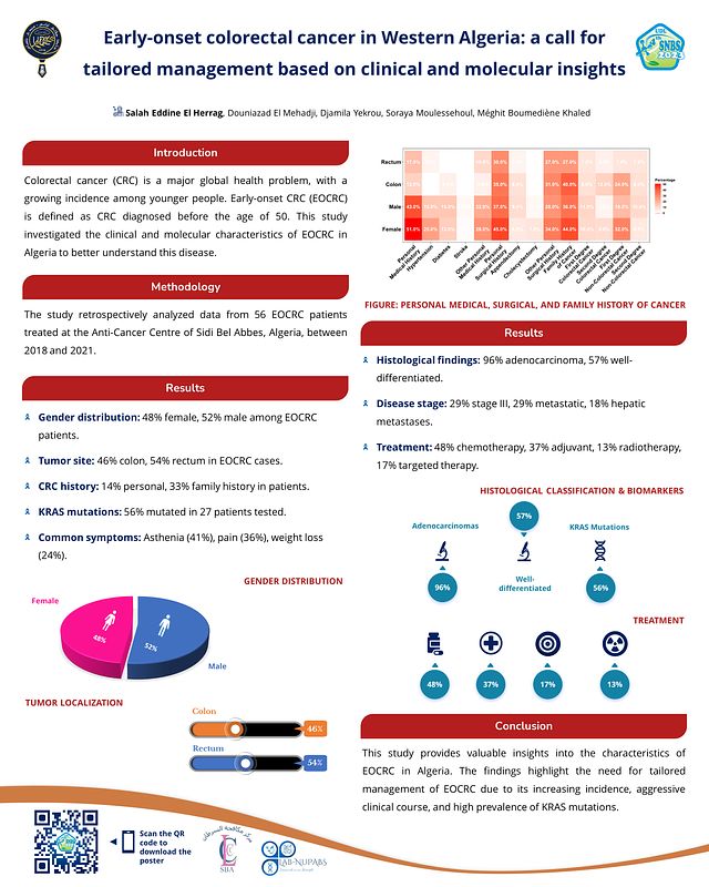 El Herrag, Salah Eddine, Douniazad El Mehadji, Djamila Yekrou, Soraya Moulessehoul, and Méghit Boumediène Khaled. “Early-Onset Colorectal Cancer in Algeria: A Call for Tailored Management Based on Clinical and Molecular Insights.” 4ᵗʰ national seminar of biology and health (SNBS). Djillali Liabes University, 2023.