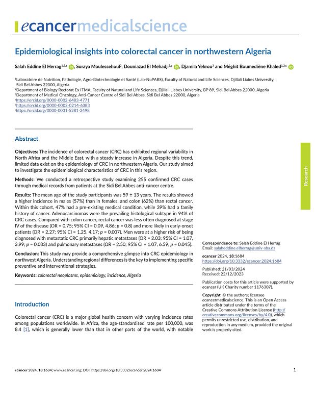 El Herrag, Salah Eddine, et al. “Epidemiological Insights into Colorectal Cancer in Northwestern Algeria.” Ecancermedicalscience, vol. 18, Mar. 2024, p. 1684, doi:10.3332/ecancer.2024.1684.